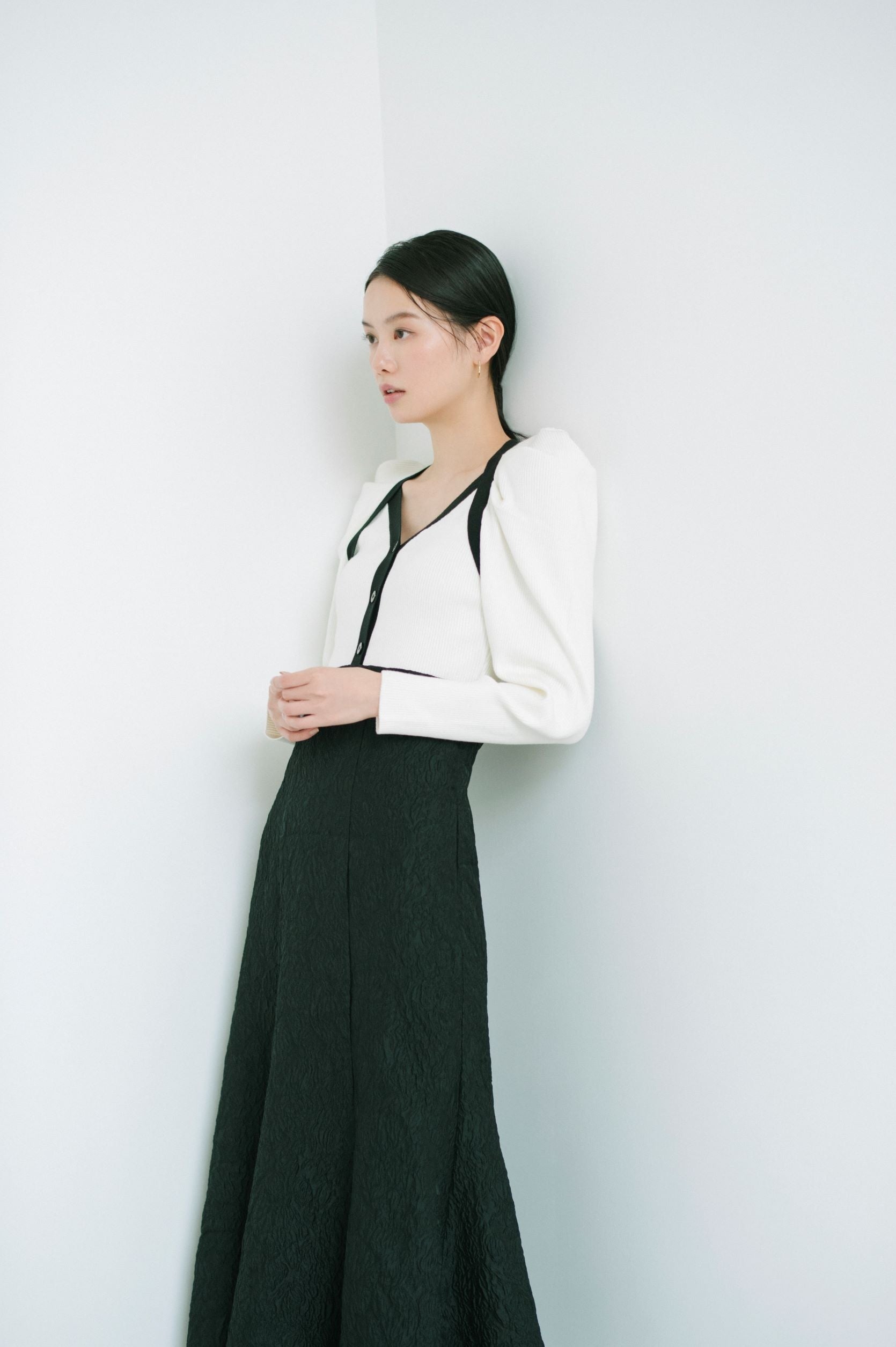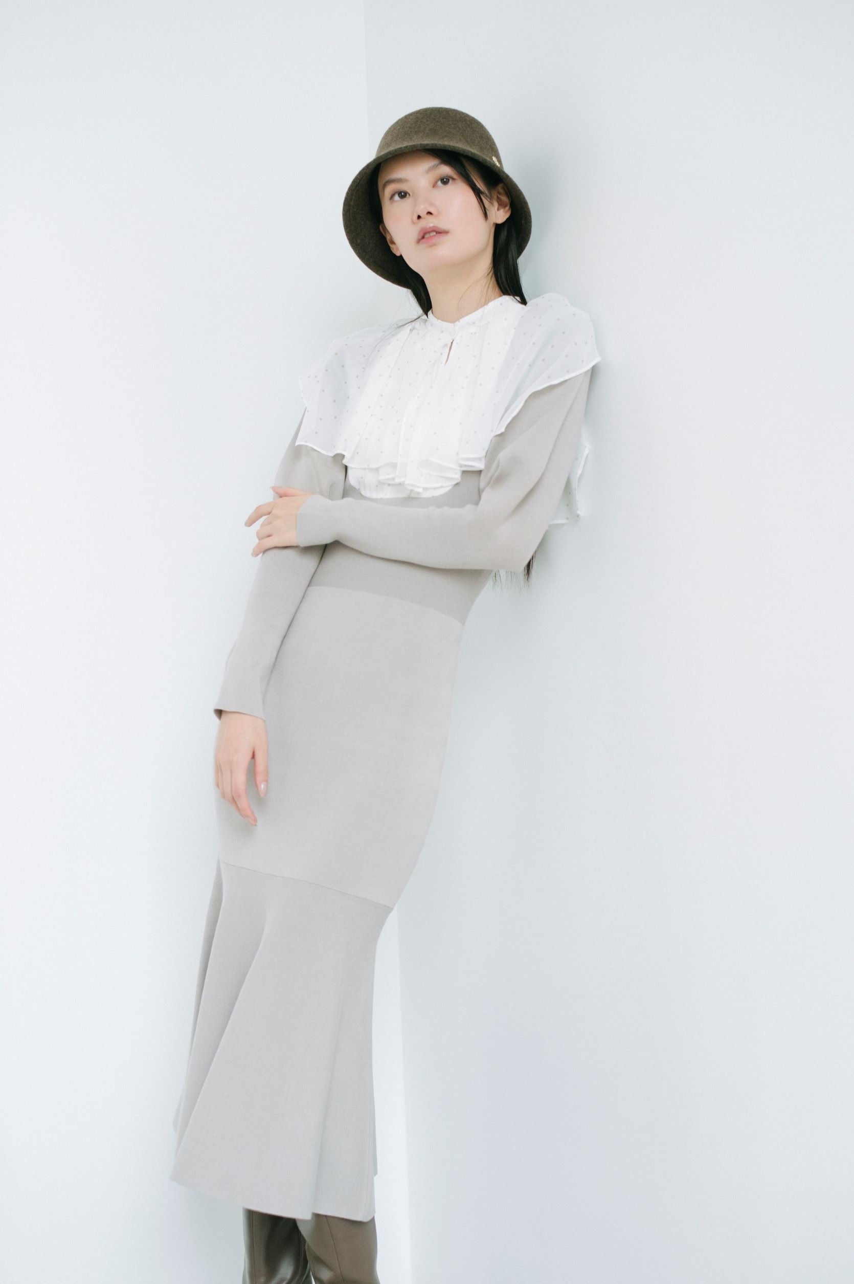 ブラックがアクセントになったビッグショルダーのニットに、表面感のあるジャガードマーメイドスカートを組み合わせた、ドッキングデザインのワンピース。