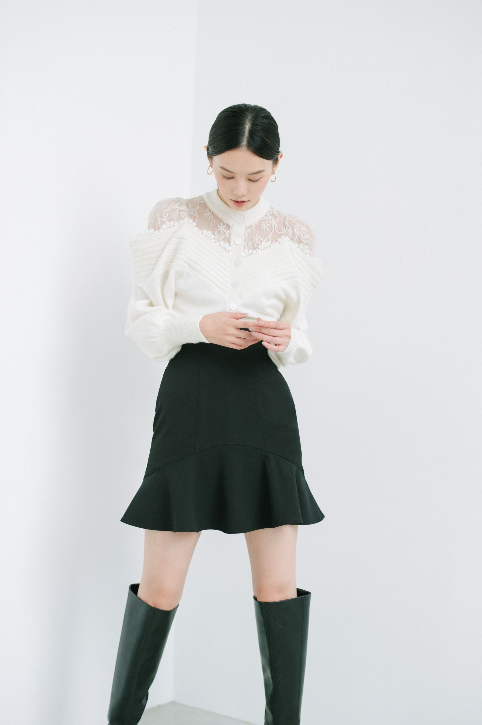 レイヤード風に見せたシアーなレースの切り替えが印象的なニットプルオーバー。