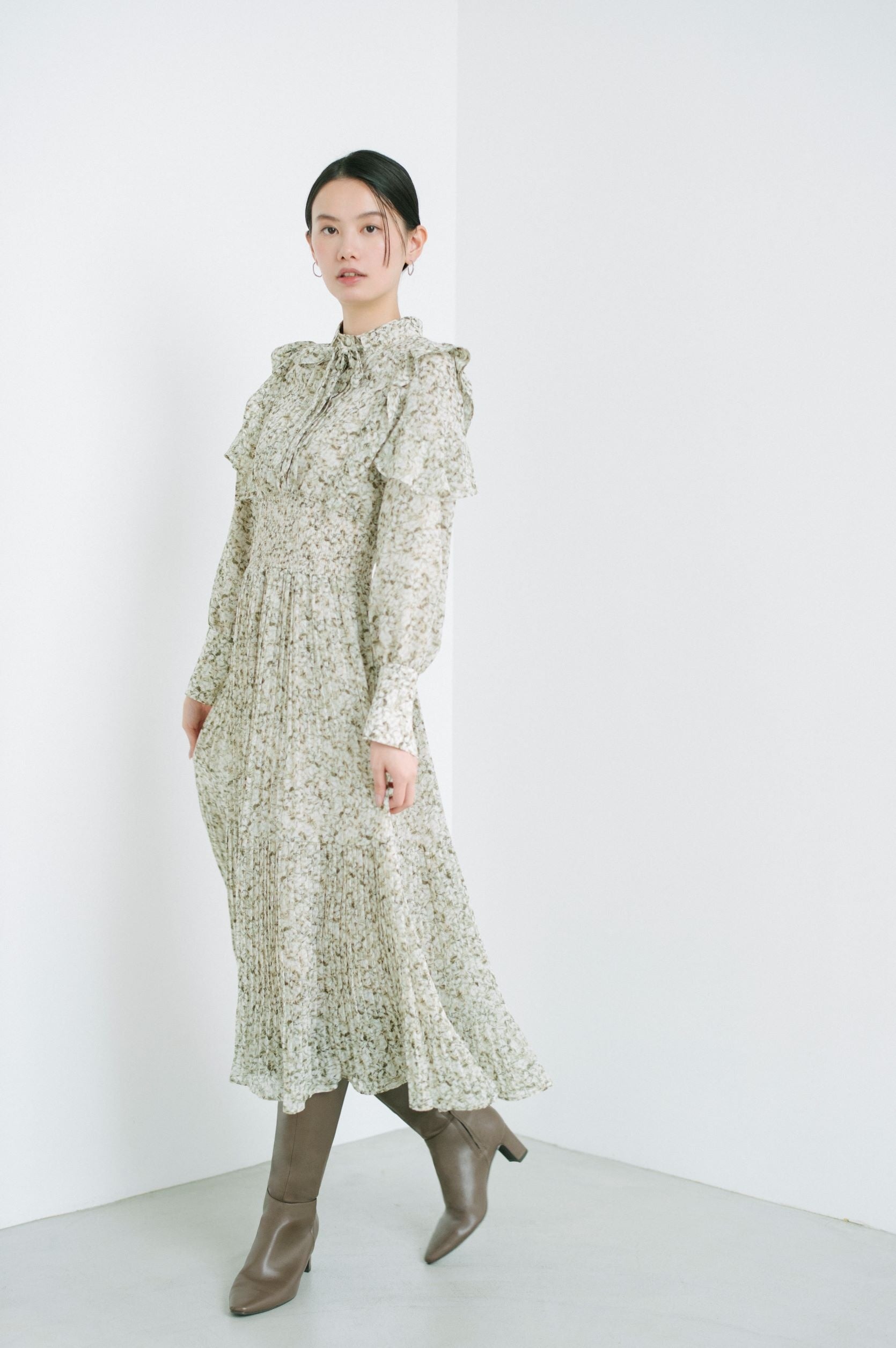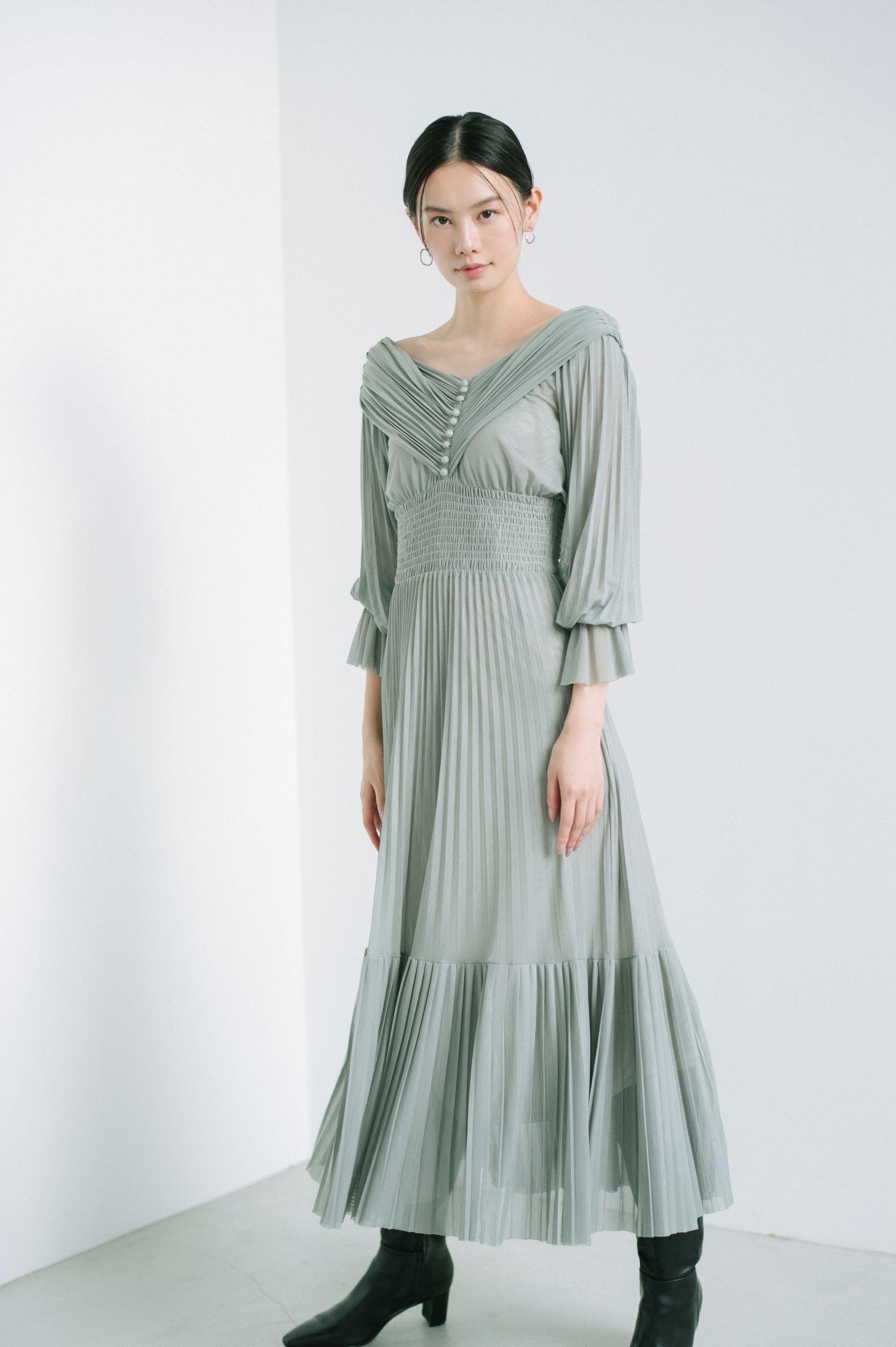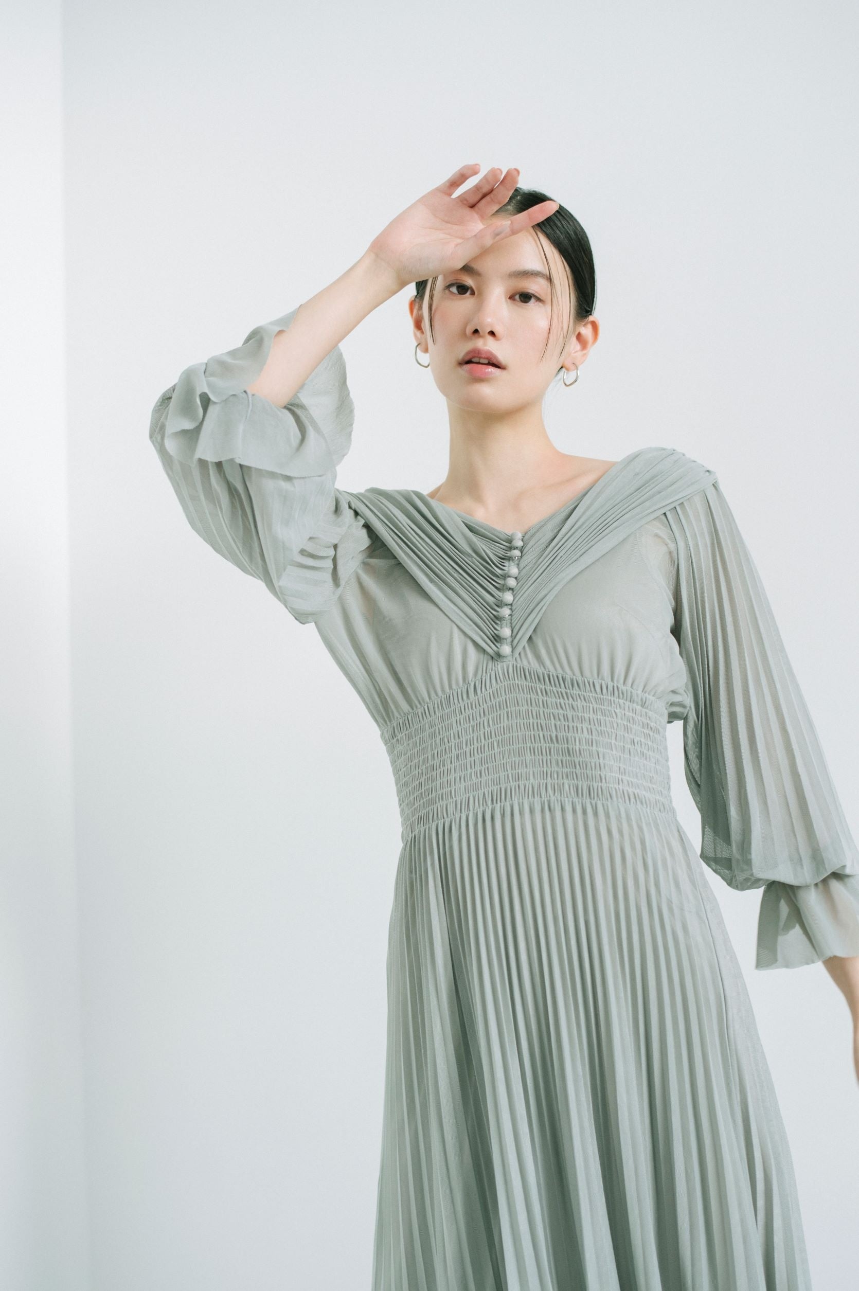 たっぷりとプリーツを施し、程よい透け感が女性らしい1着。