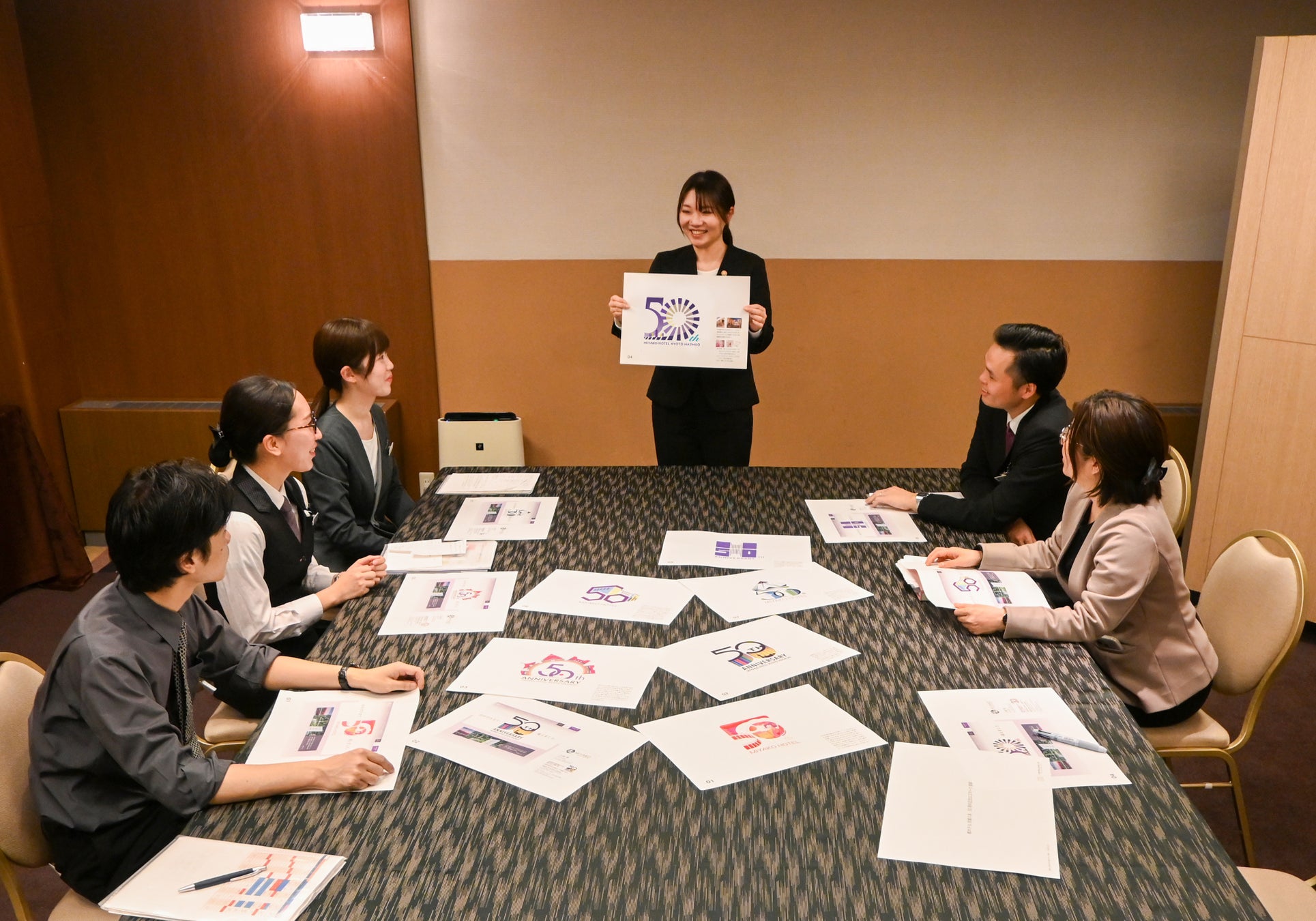 ホテルスタッフによる投票と、50周年事業をけん引するスタッフ10人のプロジェクトチームによる厳正なる選考の結果、同大学美術学部 デザイン科 ビジュアル・デザイン専攻3年生 吉冨 空華さんのデザインに決定しました。このロゴマークは、開業月の3月から8月までの約半年間にわたり展開する開業50周年のさまざまなプロモーションにて使用します。