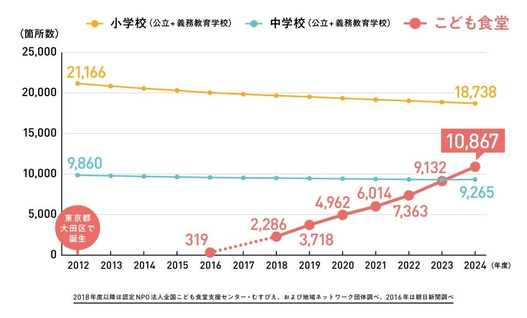 むすびえ、および地域ネットワーク団体が実施する「こども食堂全国箇所数調査」では、2024年度、全国のこども食堂が前年度(2023年度)と比較して、1,735箇所増え、10,867箇所となり、全国の公立中学校と義務教育学校の数を合わせた9,265箇所を超える結果となっております。