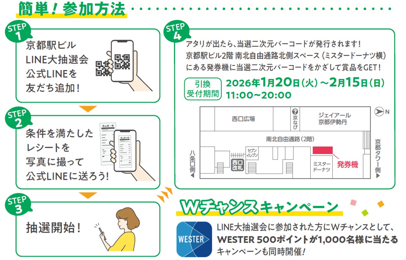 1.LINE抽選 ●京都駅ビルLINE抽選会のアカウントを友だち追加してキャンペーンに登録 ●対象店舗で会計2,000円(税込)以上の購入レシートを、トーク画面に送信し、抽選キャンペーンに応募 ●即座に当落結果がLINEのトーク画面に自動送信 ●当選の場合は、賞品引換え用の二次元コードをLINEトーク画面に自動送信 ●下記の引換会場で、自動発券機に二次元コードをかざし、共通商品券を受取 2.WESTER抽選(Wチャンスキャンペーン) ●LINE抽選に参加された方は、同トーク画面にて「WESTER」のオンライン抽選に応募 ●抽選で1,000名に「WESTERポイント」500ポイントをプレゼント(上記、実施期間終了後) |