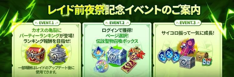 アップデートで追加された「カオスの亀裂」の新モードや新聖物ページを楽しめるように、ゲームへのログインやプレイを通じてキャラクターの成長に役立つ様々なアイテムを獲得できるお得なイベントを開催いたします。