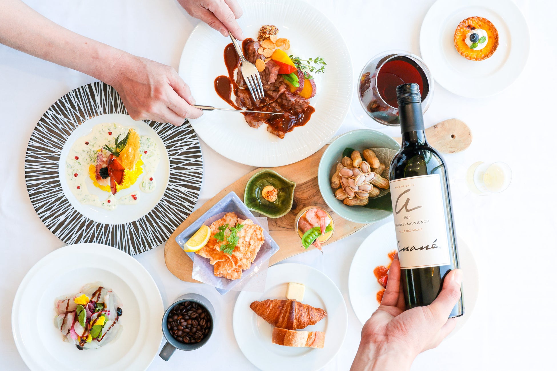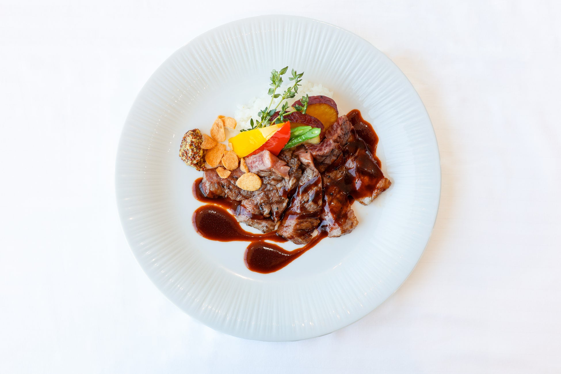 鹿児島の空と海の青をテーマにした開放感あふれるレストランでは、雄大な桜島と錦江湾を望む絶景とともに、地元食材をふんだんに使ったお料理が好評です。