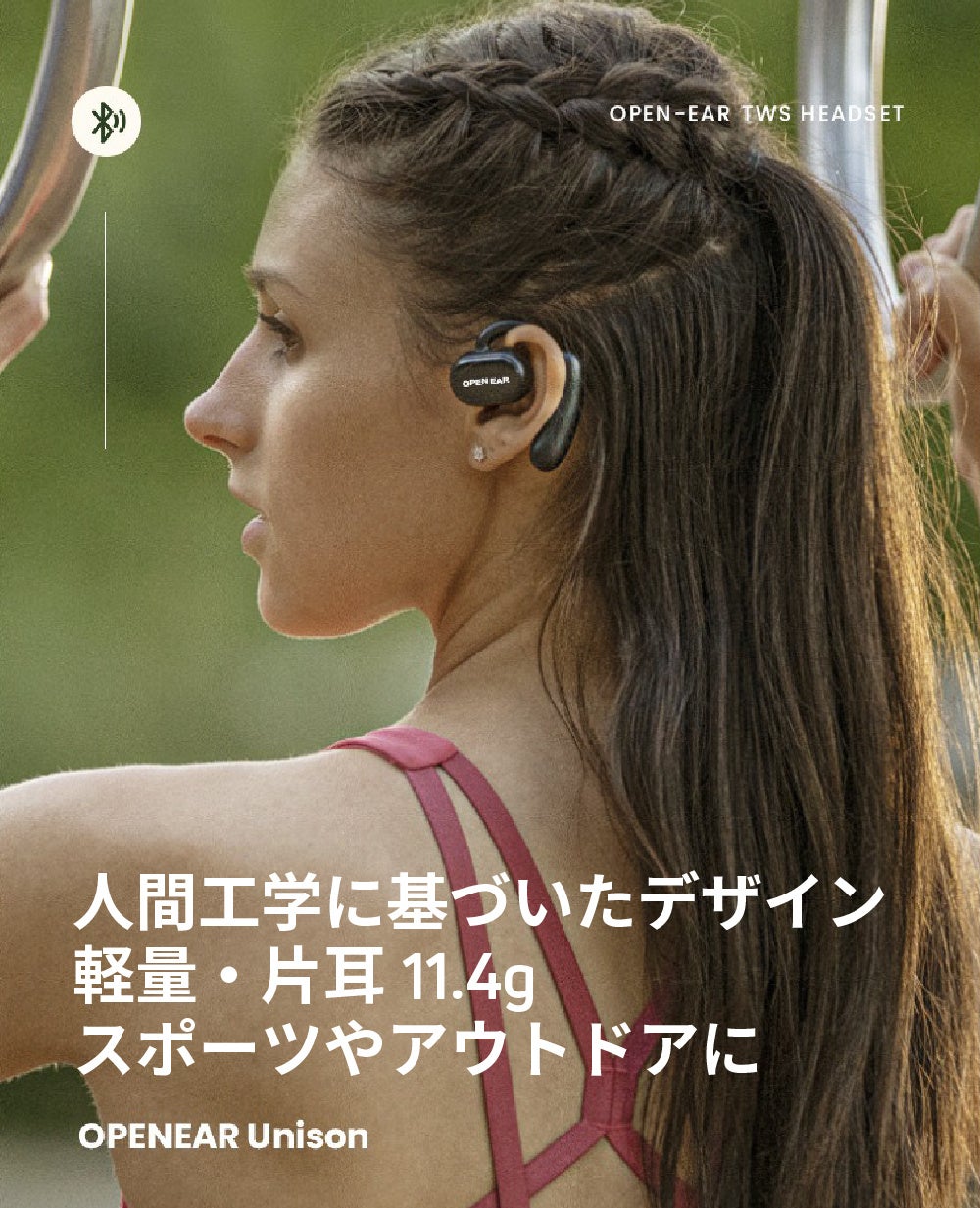 アウトドアやスポーツにも最適な軽量で快適なつけ心地、仕事や自宅で周囲の音も聞ける「ながら聴き」ができて安心