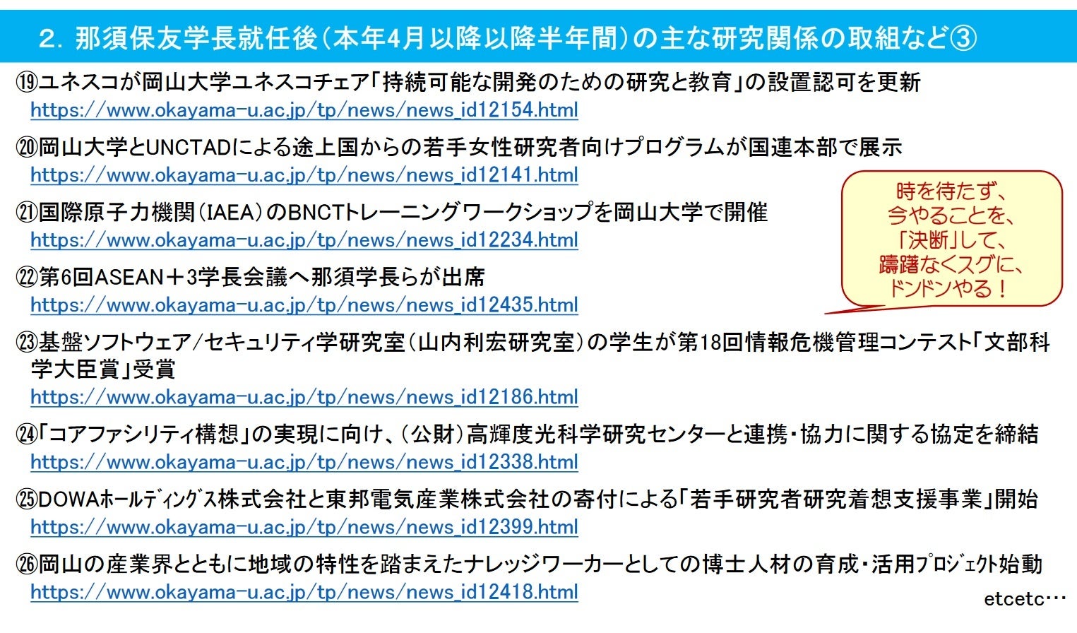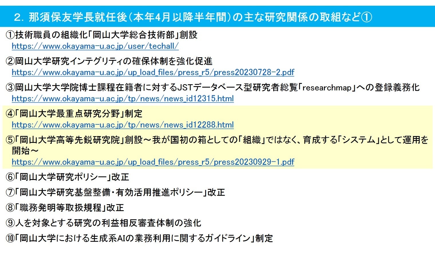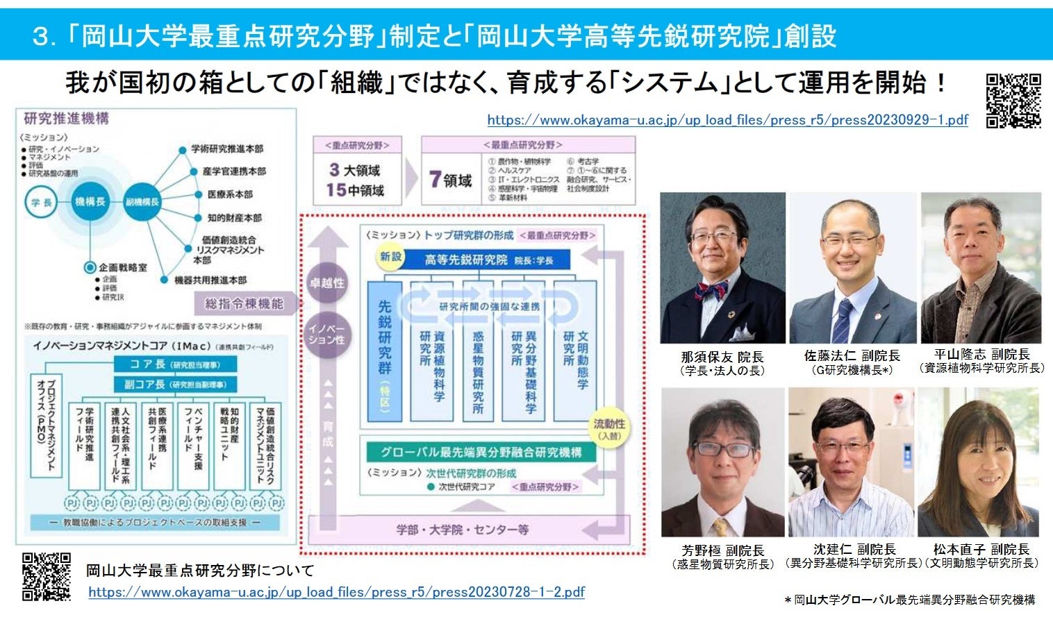 本件は、2023年10月25日に開催された「岡山大学10月定例記者会見」の学長発表「社会変革を実現する研究大学:岡山大学の機能強化として、司令塔『研究力・イノベーション創出強化実現会議』を設置・始動」において、詳細な説明がおこなわれました。