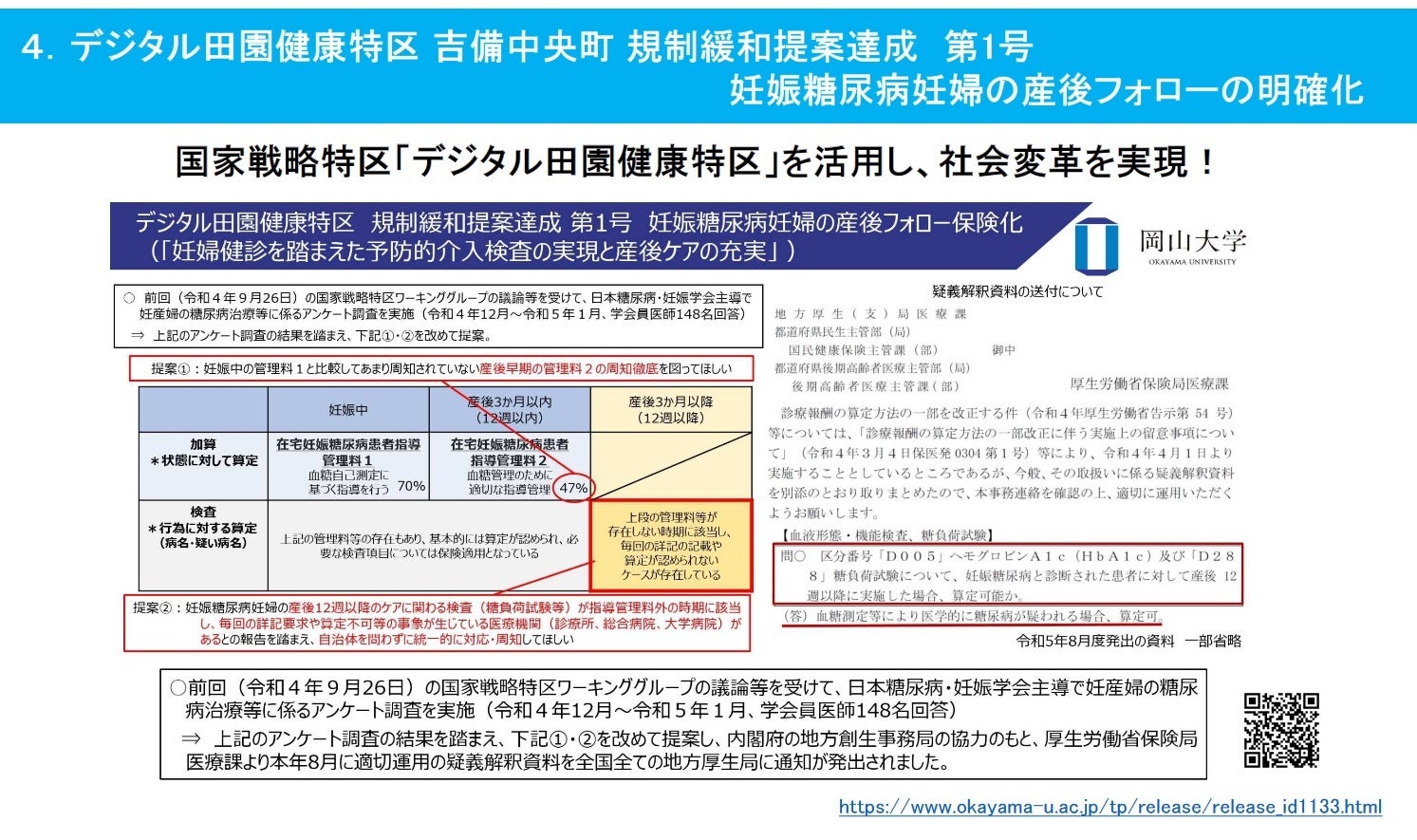※2 【岡山大学】デジタル田園健康特区 吉備中央町 規制緩和提案達成 第1号 ~妊娠糖尿病妊婦の産後フォローの明確化「妊婦健診を踏まえた予防的介入検査の実現と産後ケアの充実」~