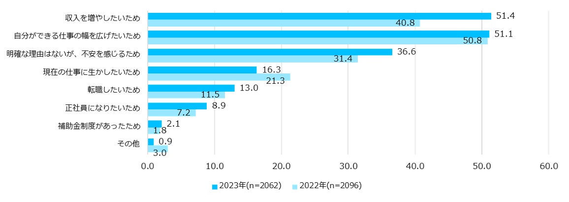 必要と感じる人に理由を聞いたところ、「収入を増やしたいため」が51.4%と最も高く、前年比10.6pt増と大幅に増加している。また「明確な理由はないが、不安を感じるため」は5.2pt増加しており、不透明な社会への不安が垣間見える結果となった。また、「収入を増やしたいため」と回答した人に、どのようなスキルを身に着けたいか自由回答で聞くと、「パソコンスキル」「IT技術」などIT関連のスキルが多かった。また、高齢化が進む中で需要が増していく「介護・福祉」や「大型運転免許」、また「英語・語学」「コミュニケーション能力」などコミュニケーションに役立つスキルなども挙がった。【図5、6】
