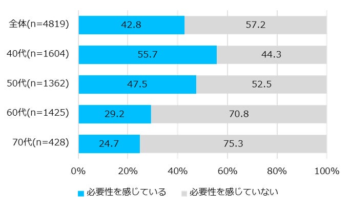 将来のための学びなおしについて、必要と感じる人は42.8%。年代別では40代で最も多く55.7%、次いで50代で47.5%、60~70代のシニア層も約2~3割の人が必要性を感じていることがわかった。【図4】