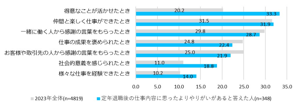 定年退職の経験があり、現在アルバイトをしているシニア層に、アルバイトに関して定年退職前のイメージと比べてのギャップを聞いたところ、「思ったよりもやりがいがある」が45.7%だった。やりがいがあると回答した人にどのような時にやりがいを感じるかを聞いたところ、「得意なことが活かせたとき」が33.3%と最も高く、全体平均と比較して10pt以上高くなった。【図7、8】