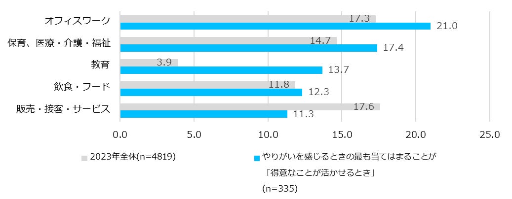 また、「得意なことが活かせたとき」と答えた人の現在の職種を見ると、「オフィスワーク(21.0%)」、「保育、医療・介護・福祉(17.4%)」、「教育(13.7%)」の順に多かった。特に「教育」は全体平均と比較して9.8pt高かった。