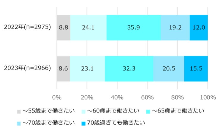 物価上昇などの影響から経済的に余裕のないと感じる人が増え、今後の就労希望年齢はますます上がっていくと考えられる。