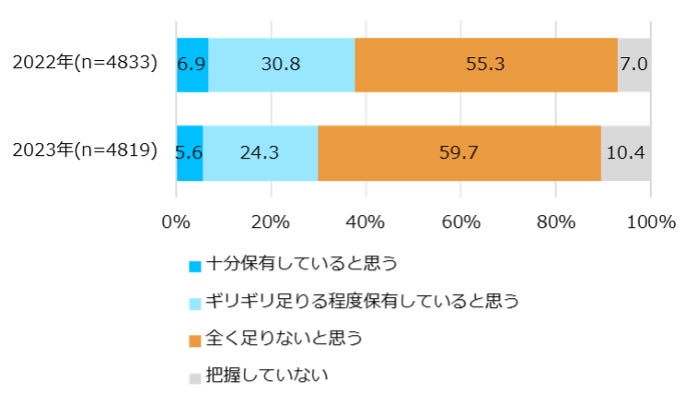 アルバイトを行うミドルシニア(40~50代)層、シニア(60~70代)層で、現在経済的なゆとりがないと答えた人は61.7%(「あまりゆとりがない」+「全くゆとりがない」)で前年比4.3pt増加。また、老後働かなくても暮らしていける程度の資産を保有していると思うかに関しては「全く足りないと思う」が59.7%でこちらも前年比4.3pt増加していた。【図1、2】