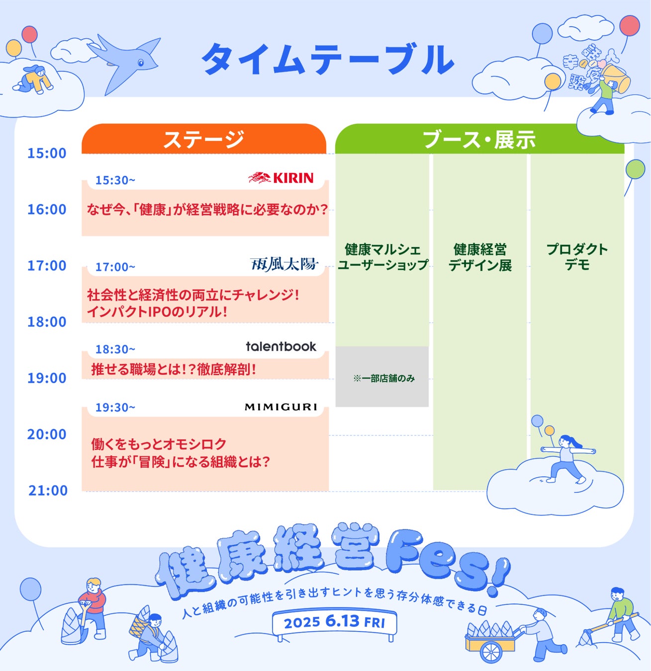 「健康経営Fes!」は、キリンビバレッジ株式会社・株式会社雨風太陽・talentbook株式会社・株式会社MIMIGURIからスピーカーをお招きし、健康経営に関する取り組み事例に触れ、健康経営をたのしく体感しながら、一歩を踏み出すきっかけを掴める、人と組織の可能性を引き出すヒントが得られるイベントです。