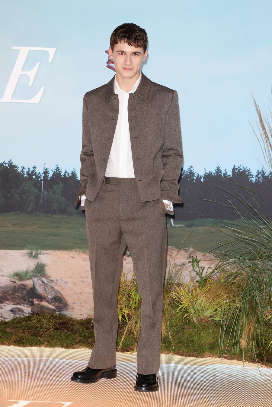 サム・ニヴォラは、2024-2025年ウィンター コレクションからライトブラウンのウールショートボタンジャケットと同色のパンツに、クラシックな白いコットンシャツを纏い、ブラックレザーの「ディオール カルロ」ダービーシューズを合わせました。