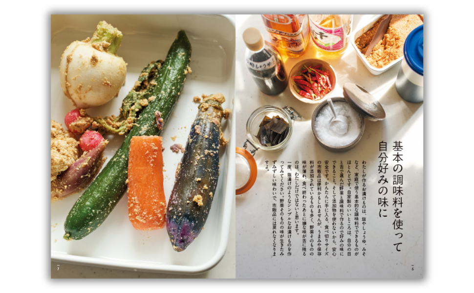 お漬けものは一番かんたんに作れる家庭料理。調味料を旬の野菜にもみ込むだけで、煮炊きせずとも時間がおいしく調理してくれます。みずみずしさを保ちながら日ごとに旨みが増し、野菜を生のまま冷蔵庫で保管するよりもぐんと長持ちするのですから、タイパもコスパも抜群。無駄なく野菜を食べきることができるSDGsな食べ方です。そして乳酸発酵が進んだお漬けものを食べると腸内環境もととのい、お肌も艶々。まさにいいことずくめなのです。
