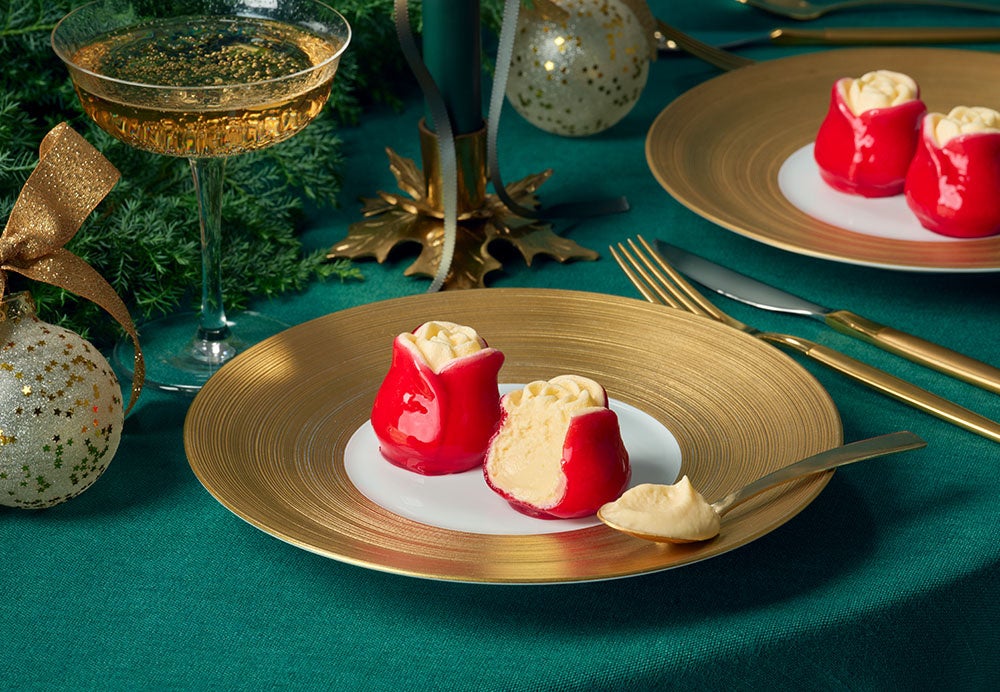とろける半生チーズケーキ仕立ての真っ赤なバラ。バン=マリィ(湯煎焼き)でじわじわ優しく火を通し、みずみずしい半生食感に仕上げました。半熟たまごのようにスプーンですくうと、とろっと濃厚にとろけだして、カマンベール&クリームチーズのコクが口いっぱいに広がります。華やかなホリデーシーズンに特におすすめしたいメニューです。
