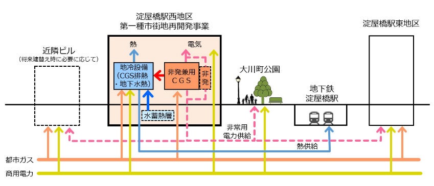 10階に地域冷暖房システムを導入し、大阪メトロ・淀屋橋駅への熱供給を行うとともに、 災害時の大川町公園等への非常用電力の融通や今後開発予定の周辺地区への熱供給等も検 討しています。また、帰宅困難者が一時滞留できる環境整備(スペース、備蓄等) 等を含めて、淀屋橋駅を中心としたエリアの防災性能の向上、BCD(※)の構築を目指します。