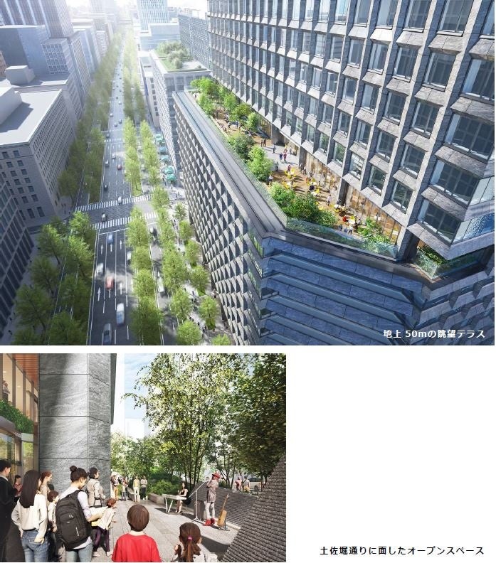 御堂筋に面した高さ50mの地上11階には、一般の方も利用できる眺望テラス( 屋上庭園、カフェラウンジ等)を整備し、中之島を一望できる新たなVIEW SPOTを創出します。