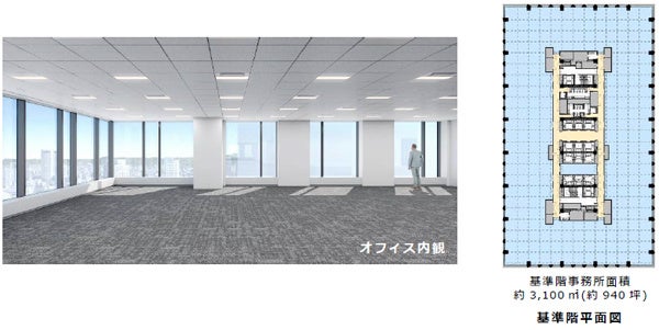 敷地の共同化・大街区化により、「大阪メトロ御堂筋線淀屋橋駅」直結の好立地において、ワンフロア貸室面積が約940~ 1,110坪、総貸室面積が約23,500坪のハイグレードオフィスを整備します。平面計画はセンターコア方式を採用することで、ワンプレートとし ても分割してもレイアウトしやすく、東西南北・四方向が窓に面した快適な執務空間を提 供します。