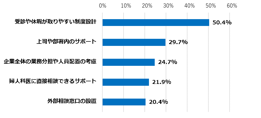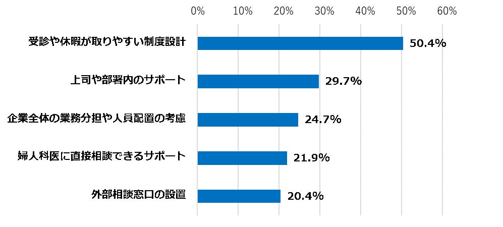女性特有の健康課題が原因となり、キャリアを築く上で何かをあきらめた経験のある女性は21.4%。必要なサポートは「受診休暇が取りやすい制度」「部署内のサポート」などが挙がる