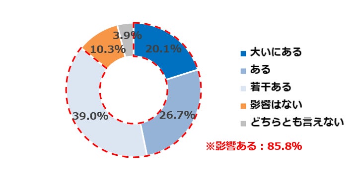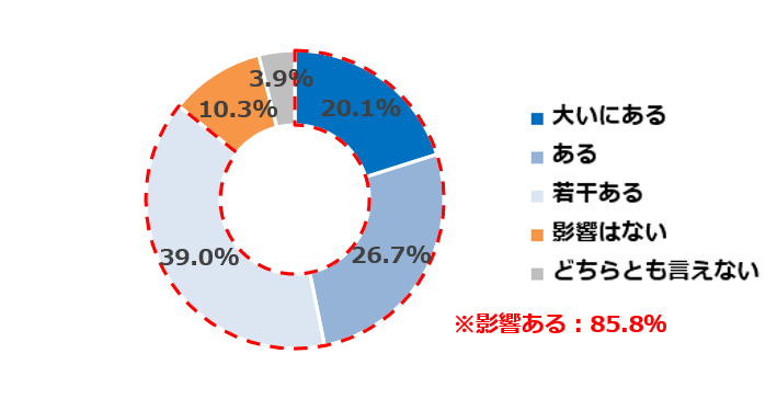 従業員の約3人に1人がメンタル面で不調を感じており、その中で仕事への影響を感じている従業員は85.8%【図3、4、5】