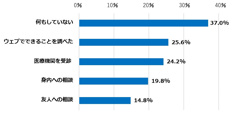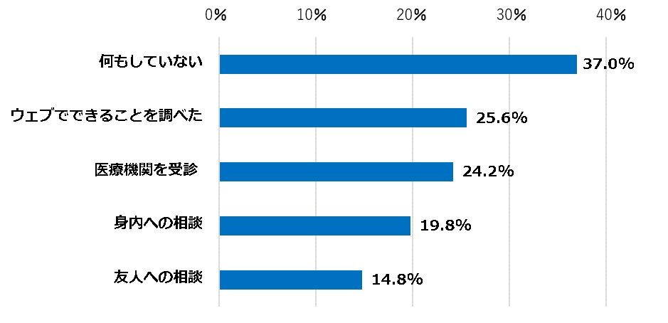 従業員にメンタル面で不調を感じることがあるか聞いたところ、「はい」と回答したのは33.4%で、そのうち仕事への影響を多少なりとも感じている人は85.8%だった。メンタル不調への対策について聞くと、「何もしていない」が最多で37.0%、次いで「ウェブで検索できることを調べた(25.6%)」「医療機関を受診(24.2%)」だった。メンタルヘルスに課題を感じながらも、自分自身で対策ができていない従業員も一定数いるようだ。【図3、4、5】