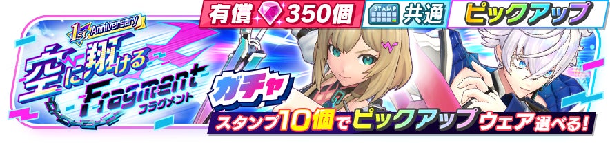ジン(CV:島﨑信長)、エル(CV:雨宮天)の新ウェアがそれぞれ2種類ピックアップで登場します。新チップや専用アクセサリーも登場いたします。また、イベント期間中は本ガチャが1日1回無料になり、10連ガチャを2回までお得に(有償ジュエル350個で)まわせます。さらに、最初の10連で「空に翔けるFragment★4メダル」が獲得できるなど、ガチャスタンプカードでもらえる報酬が豪華になっております。