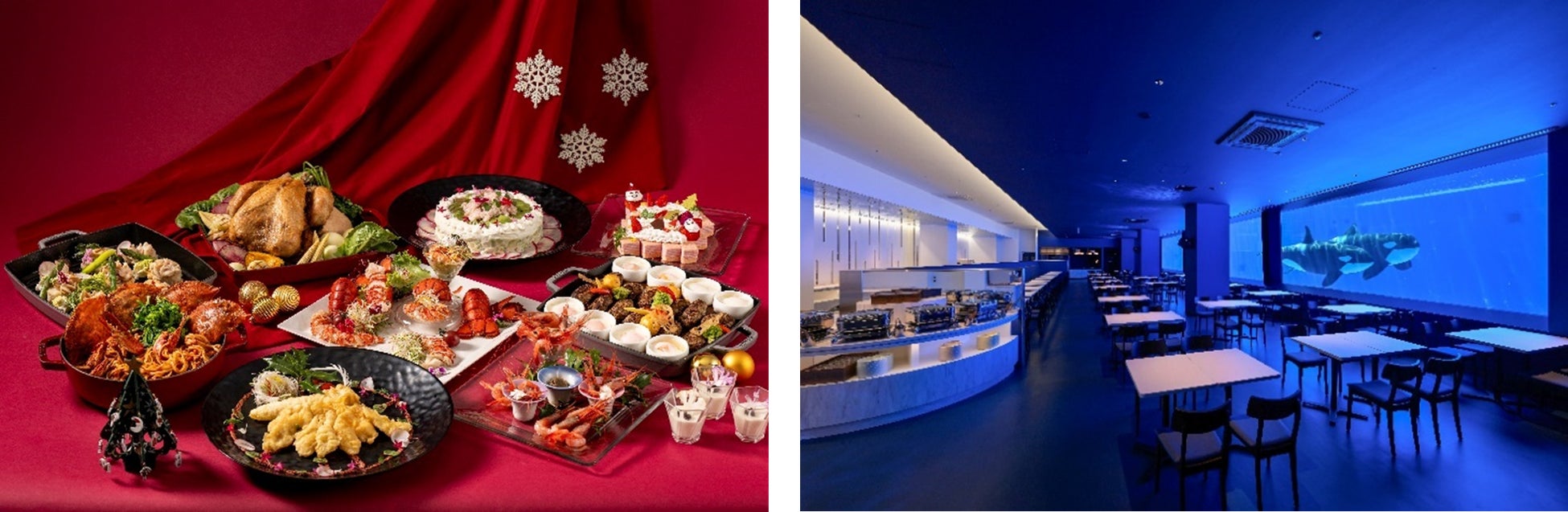 「蒼のきらめき クリスマス・ディナーブッフェ」では、閉館後のレストラン「ブルーオーシャン オルカスタディアム」を特別に開放し、シャチを間近で眺めながらクリスマスの特別なディナーブッフェをお楽しみいただけます。