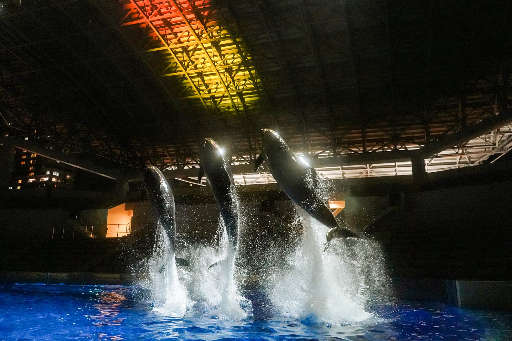幻想的な光の演出、イルカのジャンプが聖夜を彩る「ドルフィンナイトパフォーマンス」を開催