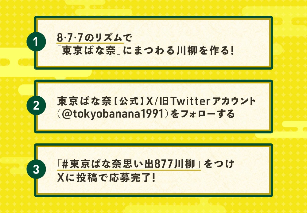 ③「#東京ばな奈思い出877川柳」をつけXに投稿で応募完了!