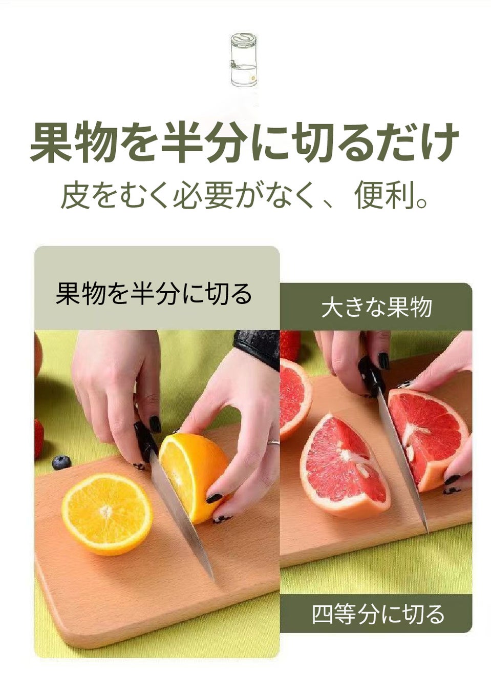 普通のサイズの果物は半分に、大きな果物は4等分ほどにすることで搾取がスムーズです。