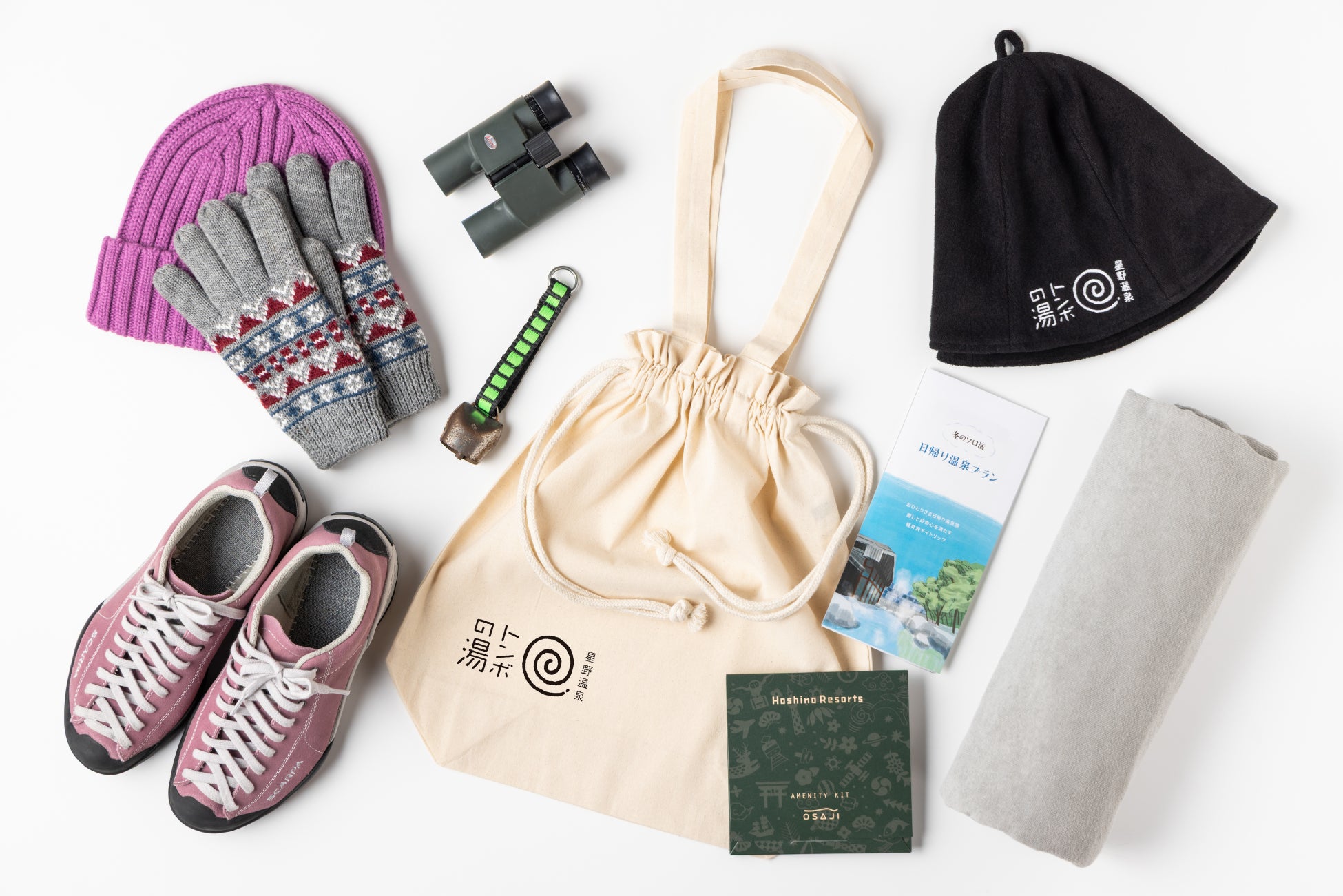 含まれるもの: 野鳥の森ネイチャーウォッチング参加費、防寒ブーツ・双眼鏡レンタル、村民食堂鍋ランチ、トートバッグ、入浴料、レンタルタオル・スキンケアセット、星野エリアチケット1,000円分、ソロジャーナル