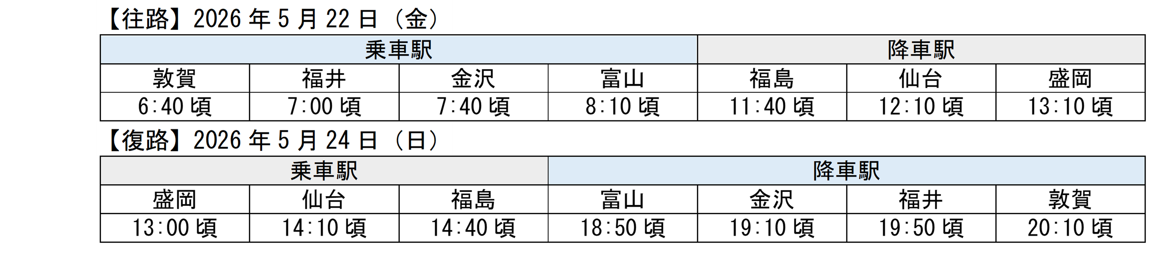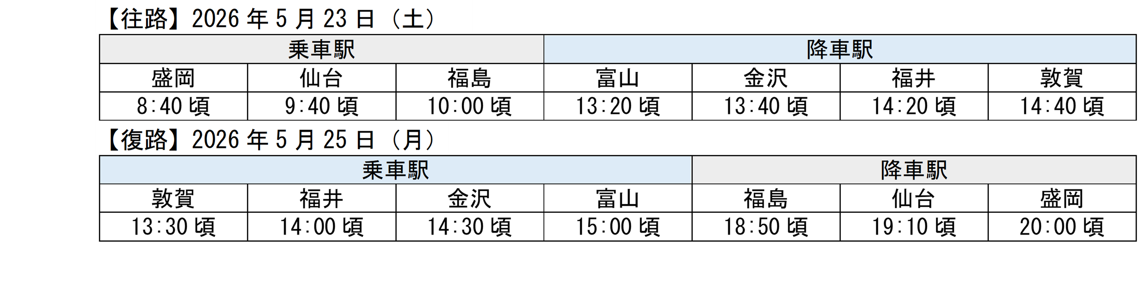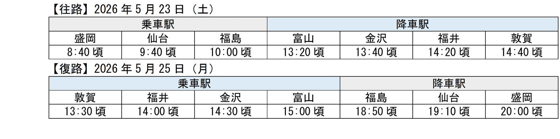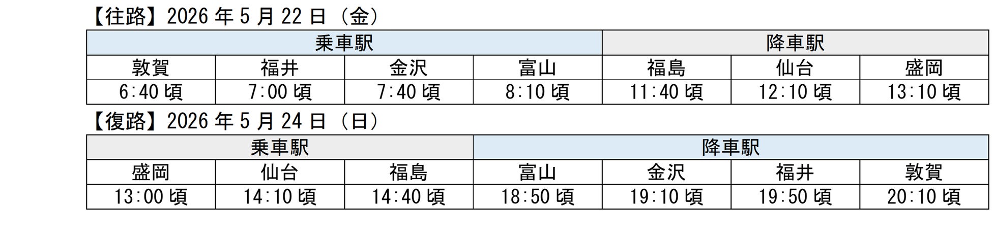 JR西日本とJR 東日本は、北陸から東北と東北から北陸でそれぞれ乗り換えなしでご利用いただける直通の団体専用臨時列車を運転します。