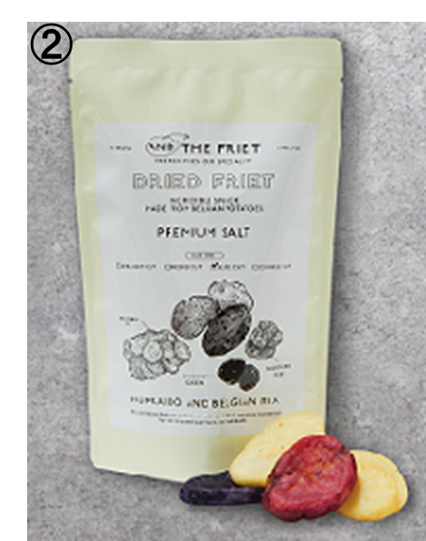 ②北海道の契約農家が作ったシャドークイーン・ノーザンルビーのドライフリットと、ベルギーから取り寄せた芋に、プレミアムソルトをまぶしたドライフリットです。