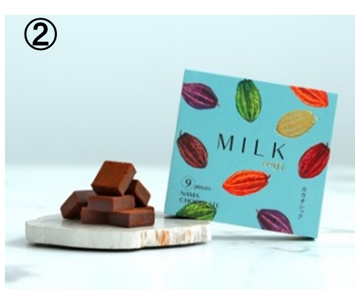 ②カカオの豊かな香りと、ミルクの甘みがバランス良い生チョコレート。ほどよい上品な甘さで、良質なミルクの風味が際立つ、シンプルでコク深い一粒です。
