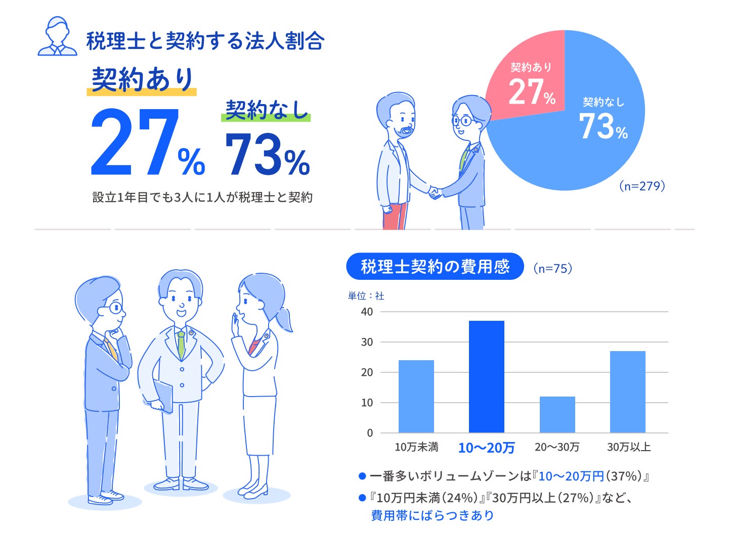 また、税理士契約をしている設立1年目の企業では税理士の年間契約費用として「10〜20万」が37%で最多となり、次いで「30万以上が」27%という結果となりました。費用帯にばらつきはあるものの76%が10万円以上で契約を行っていることがわかりました。