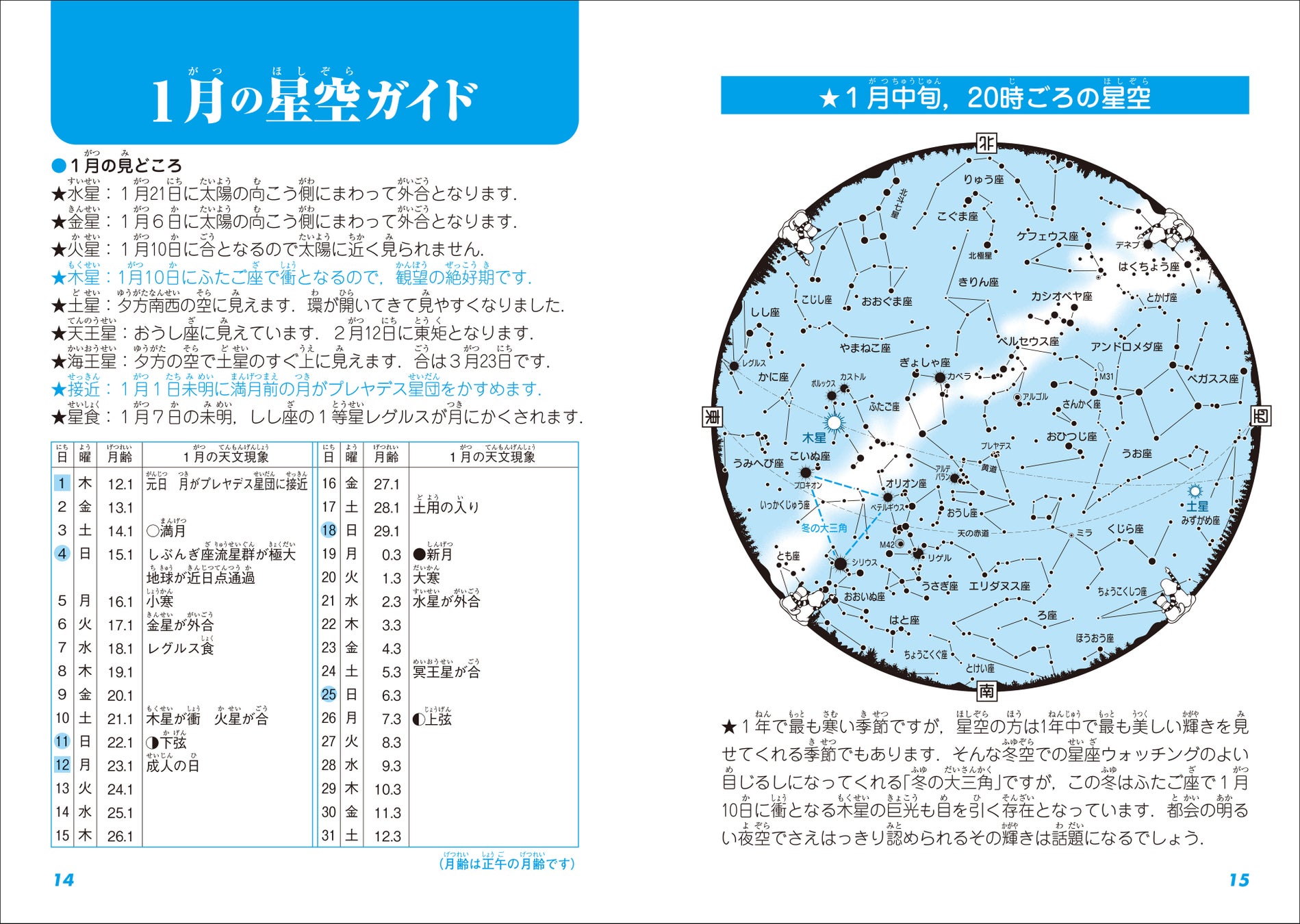2026年に起こる注目すべき天文現象として、3月3日の皆既月食、8月13日のペルセウス座流星群の極大、10月5日の土星が衝について詳しく解説するほか、しぶんぎ座流星群やふたご座流星群などの主な流星群についてなど、2026年に起こる天文現象を観察できる時刻や観察方法について紹介しながらやさしく解説。