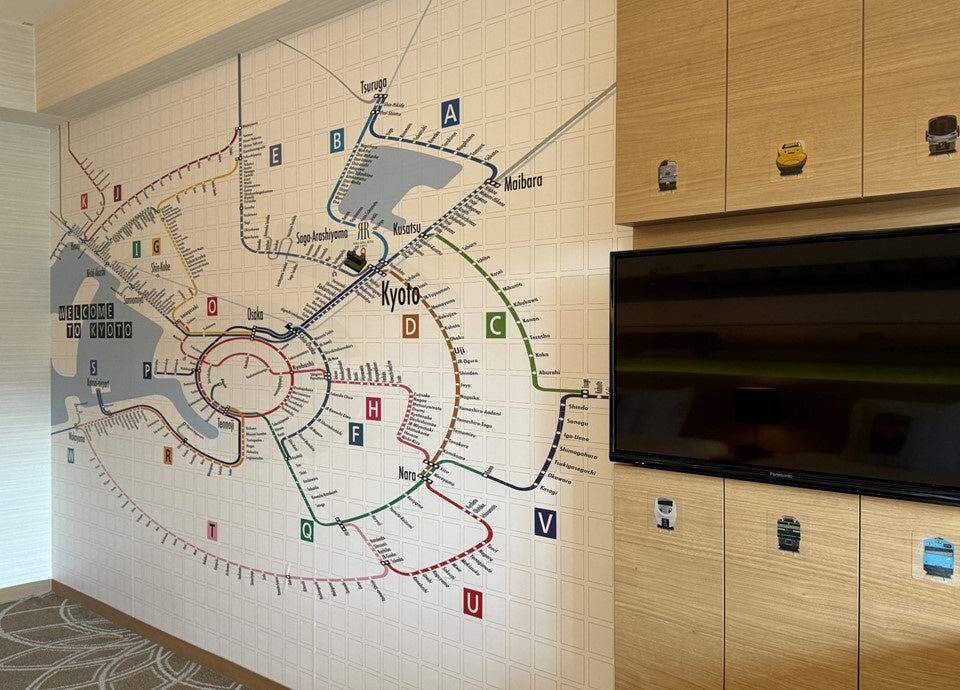 『リーガ トレインルーム 776系』へ足を踏み入れると、右手ベッドボード上には、壁一面に施した5m級の『500系(のぞみ)』のイラストが目に飛び込み、その迫力に思わず写真を撮りたくなる装飾となっています。また、左手には『700系(のぞみ)、ドクターイエロー、N700系(さくら・みずほ)』の人気車両の貴重な集合写真や『JR線近畿エリア路線図』が壁面デザインとして大胆に施され、路線図内にはお愉しみの要素として、リーガロイヤルホテル京都が描かれています。他にも、扉やクローゼット、バスルームに、関西を中心に走る電車ステッカーや、車両または駅構内で実際に使用されている「指定席」「化粧室」といったピクトグラムサインを施すことで、まるで電車の中にいるかのような雰囲気が味わえます。