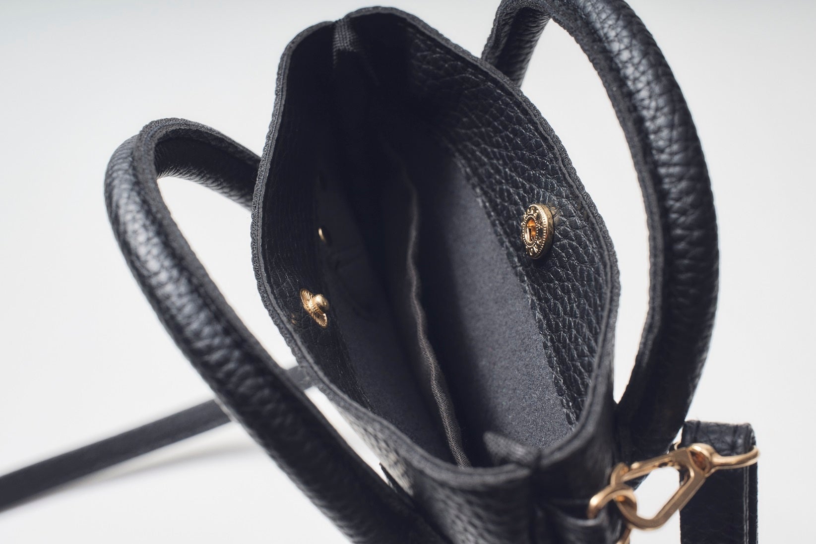 メイン収納は2ポケット仕様で、背面にも大きめのポケットが1つと、便利な3ポケット。さらに、メイン収納には安心のスナップボタン付き。ブランド定番のトートバッグをミニサイズにしたようなデザインで、本体にはブランドこだわりのハンドル付きです。
