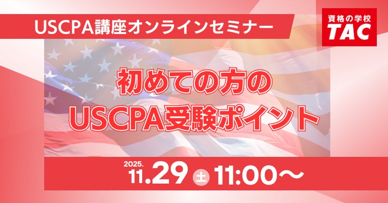 TAC株式会社(東京都千代田区、代表取締役社長:多田敏男)は、USCPA(米国公認会計士)資格取得を目指す方を対象とした「初めての方のUSCPA受験ポイント」セミナーを11/29(土)に開催!