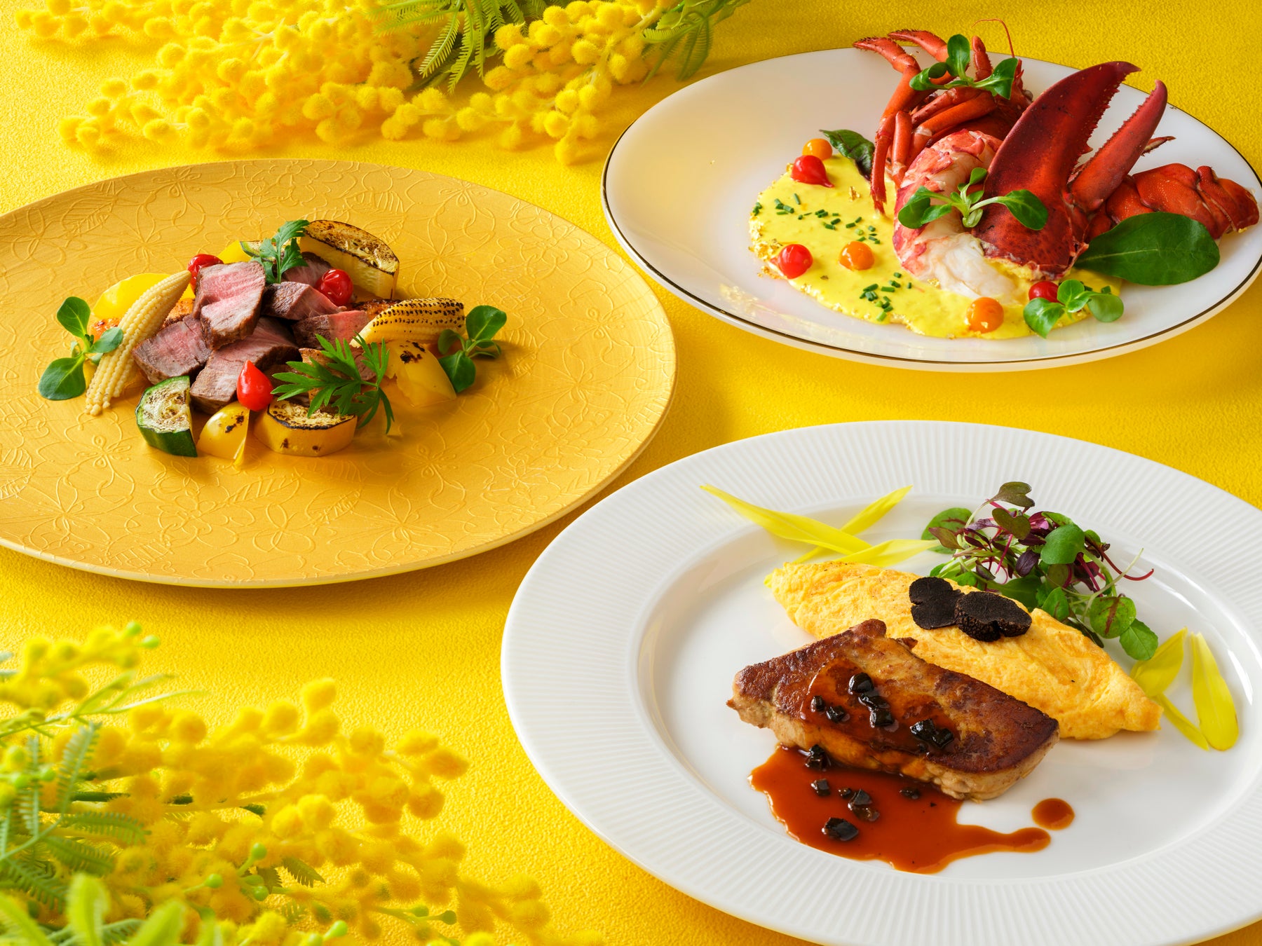 海老とアスパラガスの炒めもの、ふかひれの姿煮込み、海の幸の旨味が詰まった炒飯、マンゴープリンなどハッピーイエローの彩りを取り入れた全6品のコースです。