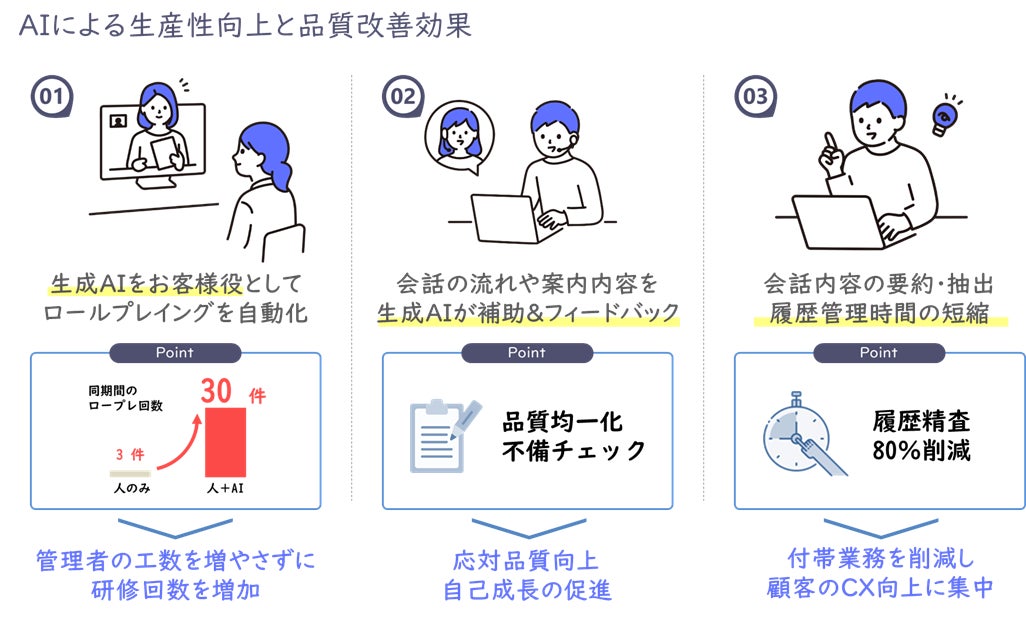 コンタクトセンターの教育をAIに置き換えることで管理者の工数削減、オペレーターの業務知識の定着率向上、デビューまでの研修期間短縮、応対品質の向上を実現できます。新人オペレーターが人手を介さずに従来の10倍のロールプレイング回数を経験でき、かつ自動的に会話内容のチェックが行われるため応対品質が均一化されます。さらに、応対履歴の入力時間も80%削減されるなど、さまざまなシーンで効果を発揮します。