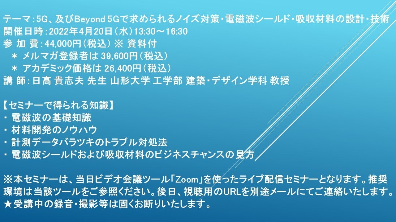 先端技術情報や市場情報を提供している(株)シーエムシー・リサーチ(千代田区神田錦町: https://cmcre.com/ )では、 各種材料・化学品などの市場動向・技術動向のセミナーや書籍発行を行っておりますが、 このたび「5G、及びBeyond 5Gで求められるノイズ対策・電磁波シールド・吸収材料の設計・技術」と題するセミナーを、 講師に日髙 貴志夫 先生 山形大学 工学部 建築・デザイン学科 教授)をお迎えし、2022年4月20日(水)13:30より、 ZOOMを利用したライブ配信で開催いたします。 受講料は、 一般:44,000円(税込)、 弊社メルマガ会員:39,600円(税込)、 アカデミック価格は26,400円(税込)となっております(資料付)。