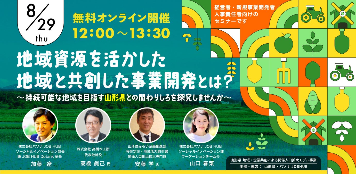 株式会社パソナJOB HUB(本社:東京都港区、代表取締役社長:髙木 元義)は、山形県より「令和6年度地域・企業共創による関係人口拡大モデル事業」を受託。本事業の一環として、都市部企業を対象としたセミナー『地域資源を活かした地域と共創した事業開発とは?~持続可能な地域を目指す山形県との関わりしろ※を探求しませんか~』を8月29日(木)にオンラインにて開催いたします。