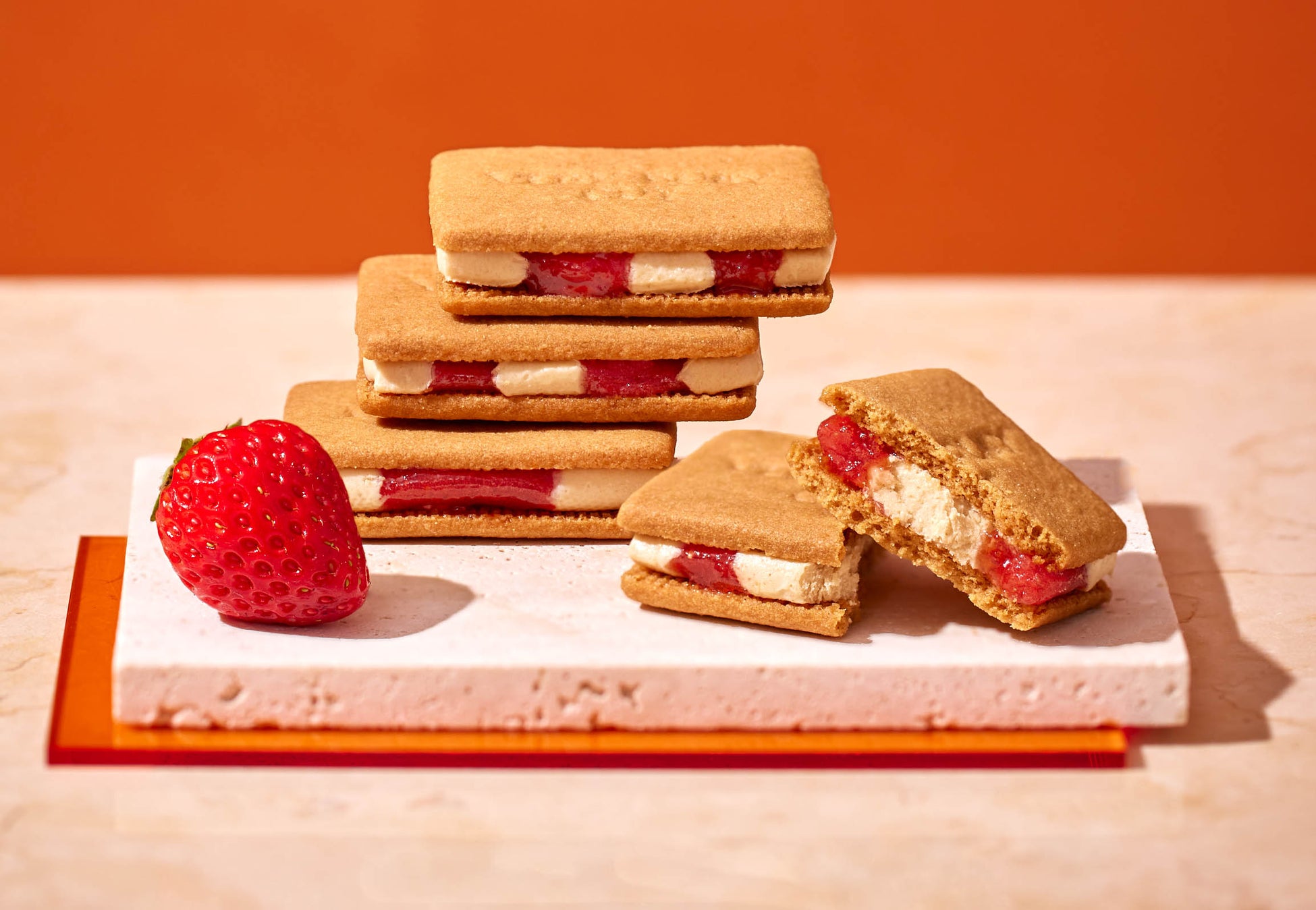 ブランドの代表作『いちごミルクサンド』。真っ赤な果肉と香り高い甘さが特徴の“イタリア産サブリナ苺”をとろっと煮詰めた苺コンフィチュールに、練乳ミルクのコクをなめらかに練り上げたホワイトショコラ。ふたつが柔らかなまま組み合わさった“とろけるダブルメルト製法”が美味しさの決め手です。お口の中で苺とミルクが同時にとろっと溢れる至福の美味しさを、しっとりしたクッキーでサンドしました。