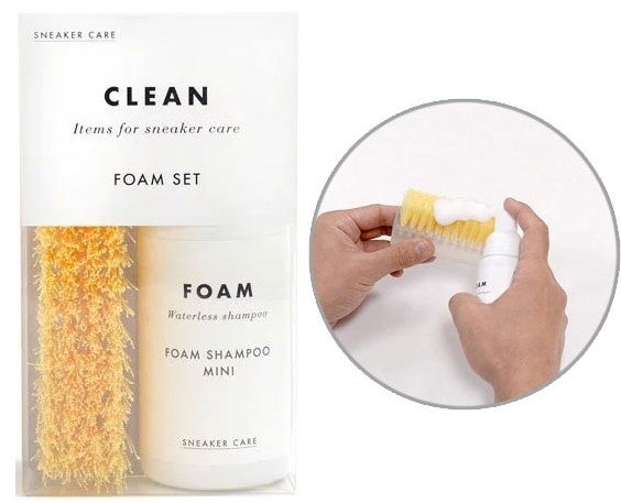 すすぎ不要のスニーカー用フォーム シャンプーとウォッシングブラシセット。