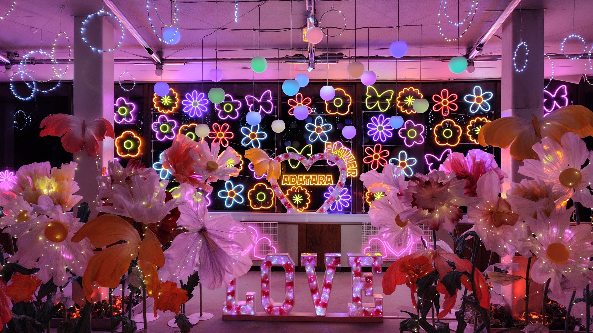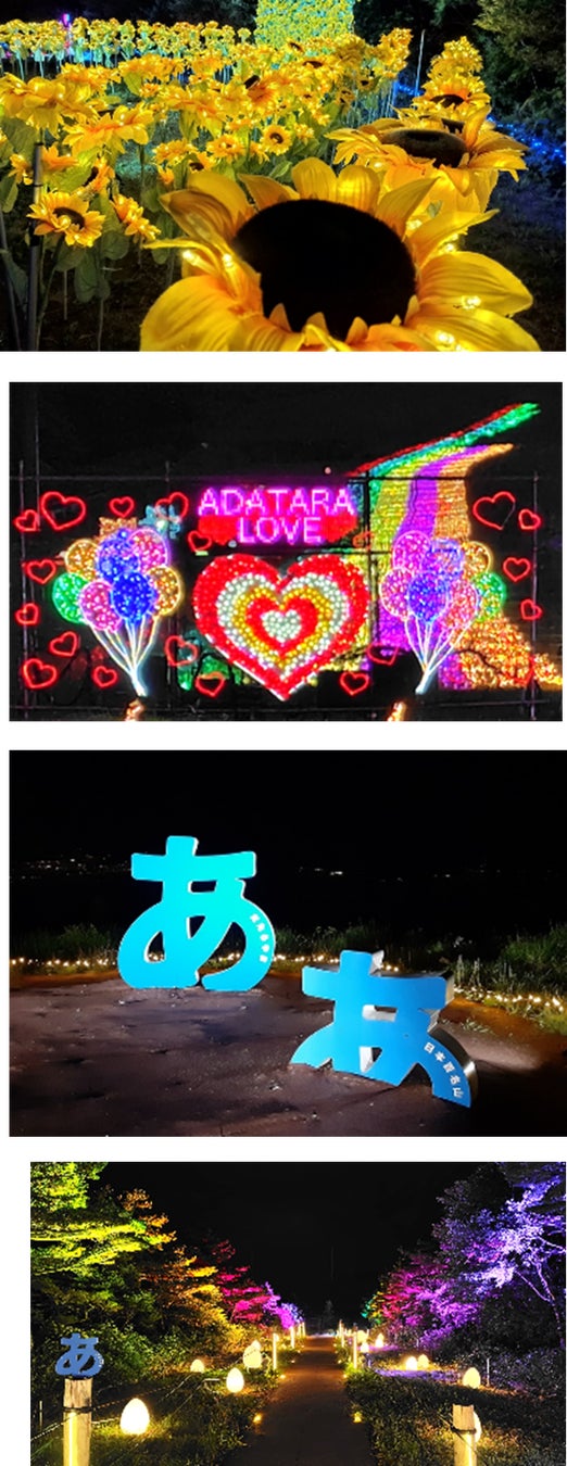 ロープウェイ山頂駅の旧スキーゲレンデ展望広場のフォトスポット「あだたらやま」の「【あ】のオブジェ」がイルミスポットに進化して新登場。様々なサイズの「あ」の文字が散りばめら「【あ】の道」もカラフルな光でライトアップされ、昼と夜とで違った魅力 をお楽しみ頂けます。「あ」ぶくまの山々を背景に、豊かな成長を繰り返す「あ」だたらやまで、不思議な「あ」の映え写真を撮って