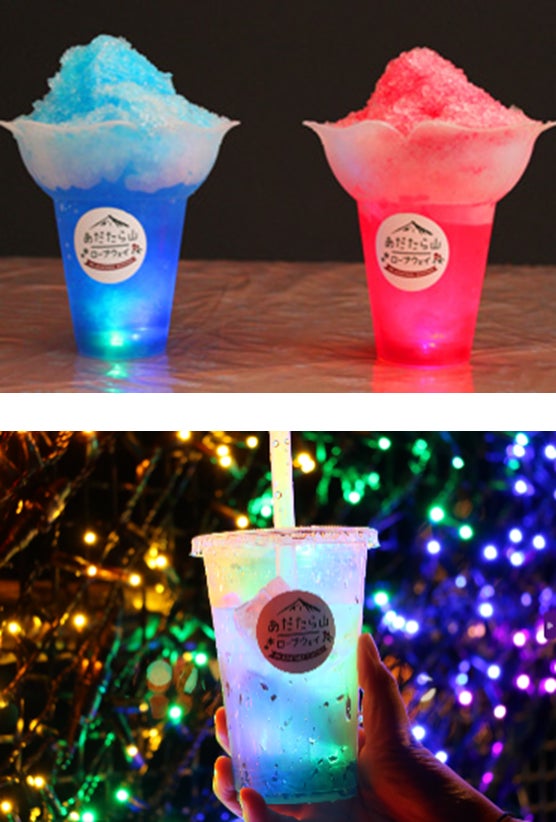 イルミネーションとともにお楽しみいただける、新メニュー「光るかき氷」や「光る氷ドリンク」が登場いたします。どちらもワンハンドで持てるので、イルミネーションとの撮影も可能です。