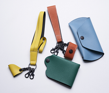 〈オットロッシ〉マスクケース 横方向二つ折り立体マスク用(紫、水色) 3,520円、縦方向二つ折り(緑) 2,860円、ネックストラップ(黄色) 3,520円、ハンドストラップ(オレンジ) 3,520円